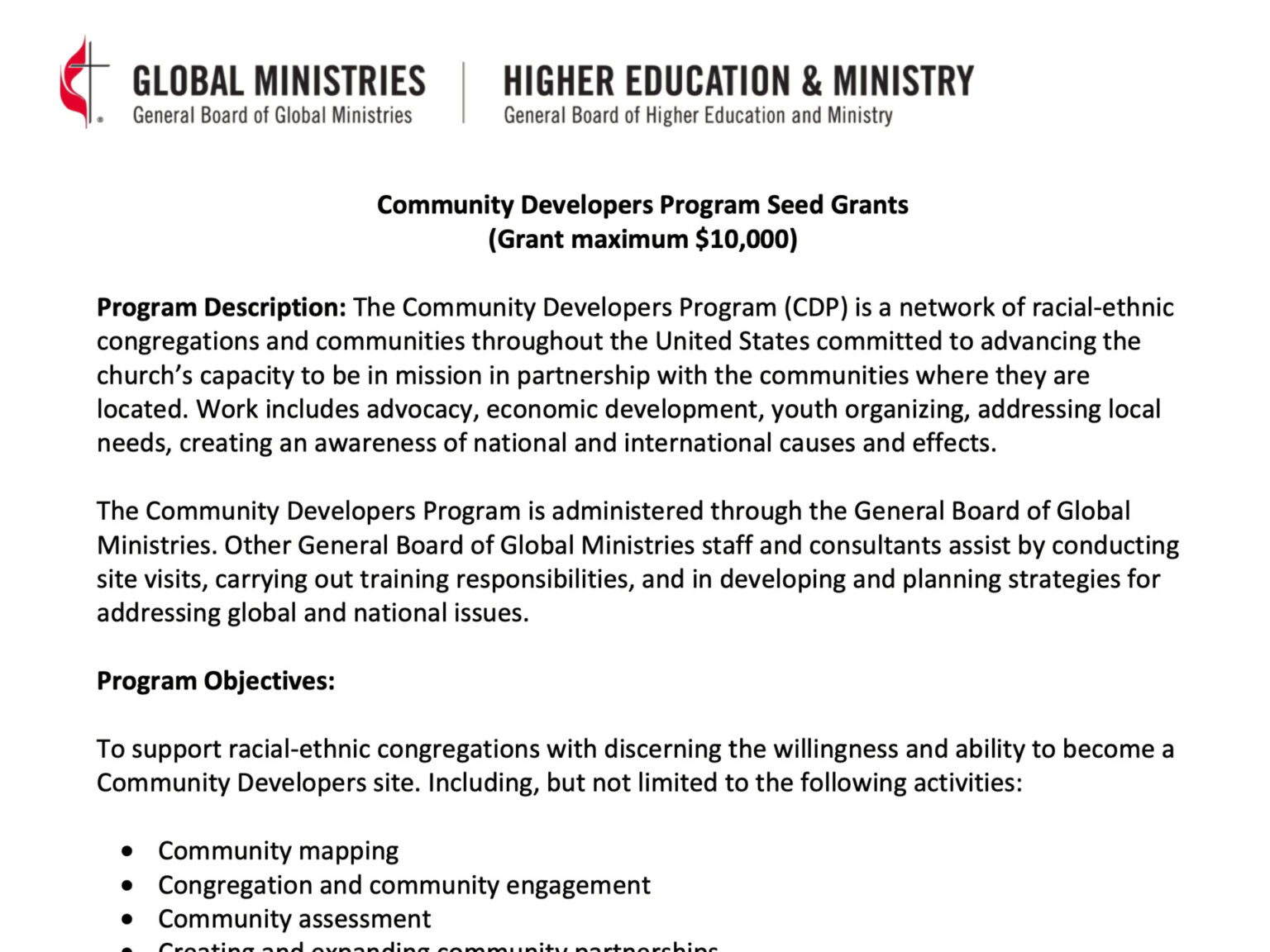 Grant application for local racial ethnic congregations to explore becoming a Community Developers Program (CDP) site.