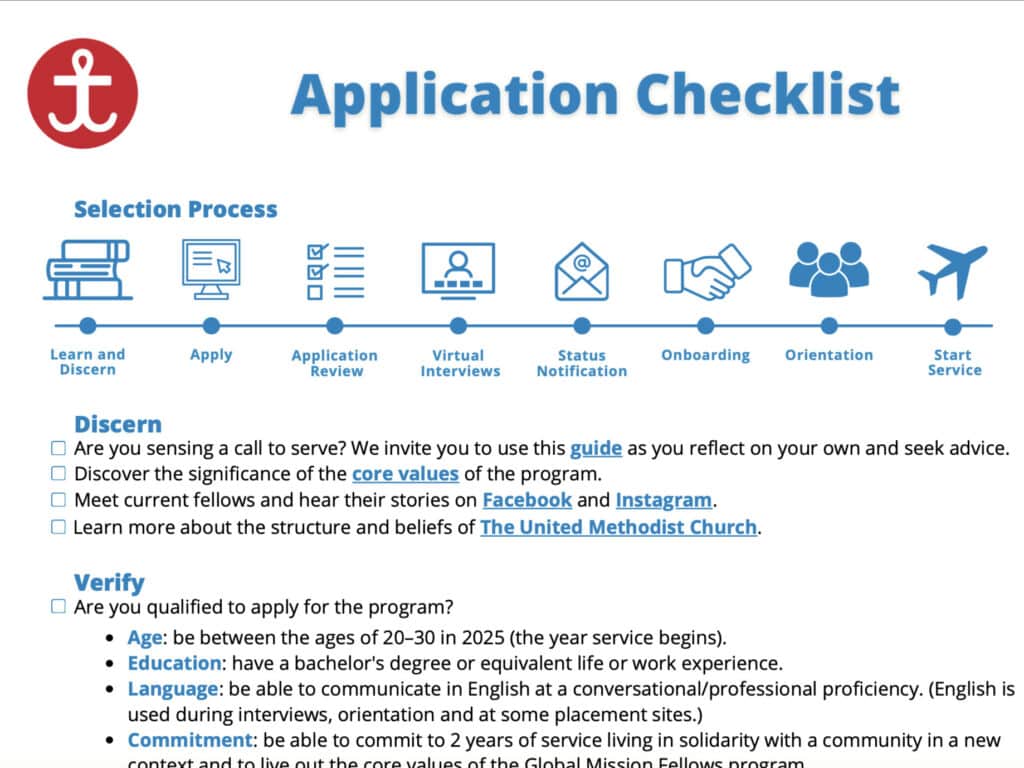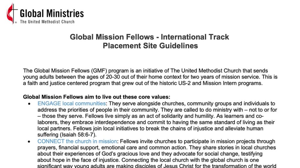 Information on becoming a Global Mission Fellow (GMF) including requirements, benefits, service opportunities, next steps, and important dates.