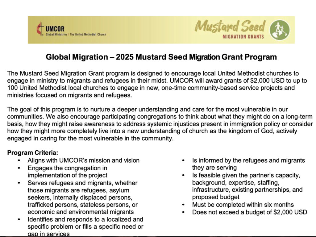 Grant application for the UMCOR Mustard Seed Migration program to help United Methodist churches in the U.S. engage in ministry with migrants in their communities.