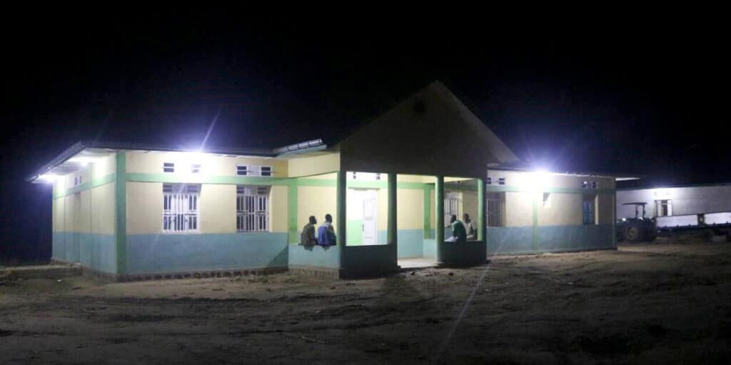 The new buildings are joined by a covered walkway that is airy and open. Contractors drilled a borehole to tap a clean water source and a pump and pipe system sends water where it is needed. A new solar panel array provides the hospitalโs electricity for the water system and for lighting. Even at night, the hospital has light, and women no longer deliver their babies in the dark. New sanitation facilities complete the construction.