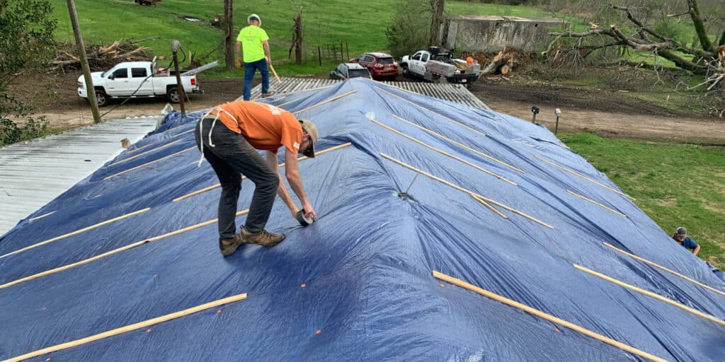 AWF Early Response team works on the roof of a house struck by the March 2021 four- county tornado. PHOTO: COURTESY OF AWF CONFERENCE DISASTER RESPONSE OFFICE