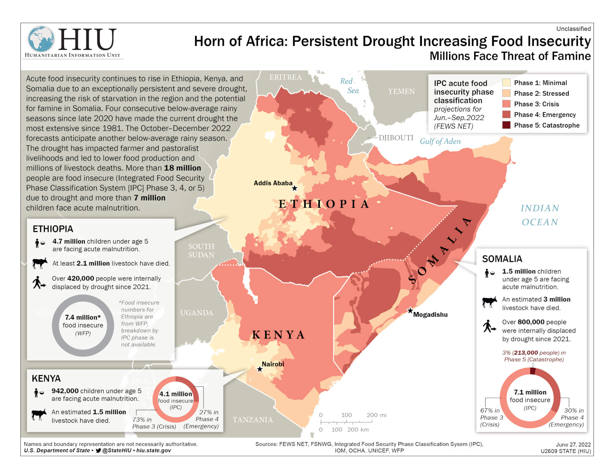 Information gathered by the U.S. State Department’s Humanitarian Information Unit (HIU) estimates that nearly 18 million people in Somalia, Kenya and Ethiopia face severe hunger because the region has had lower-than-average rainfall for four consecutive years. In addition to this climate change, armed conflicts, rising international food and fuel prices, and the COVID-19 pandemic magnify the current crisis. Russia’s war on Ukraine has had direct consequences for the Horn of Africa because the region depends on Ukraine for wheat and fertilizer supplies.