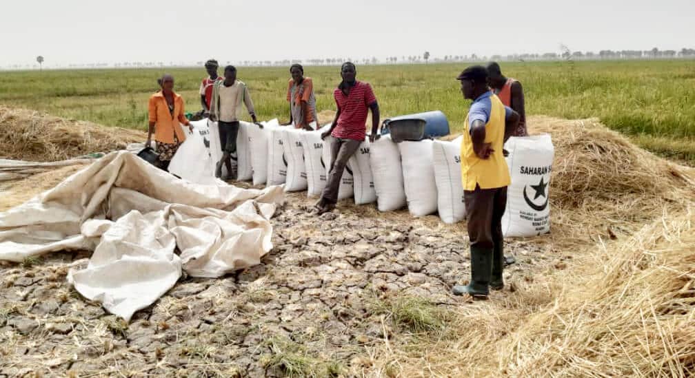 Farmers in Nigeria’s North East Conference bag rice after a bumper harvest of dry season rice farming. PHOTO: Courtesy of the Nigeria North East Conference YAI