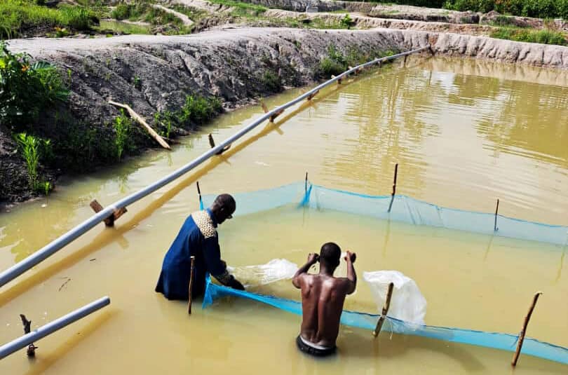 Improved tilapia fish farming in Gouagonoupleu District of Man, Côte d’Ivoire, after YAI training at the Songhai Center in Benin. PHOTO: Courtesy of Simon Nathan Koffi