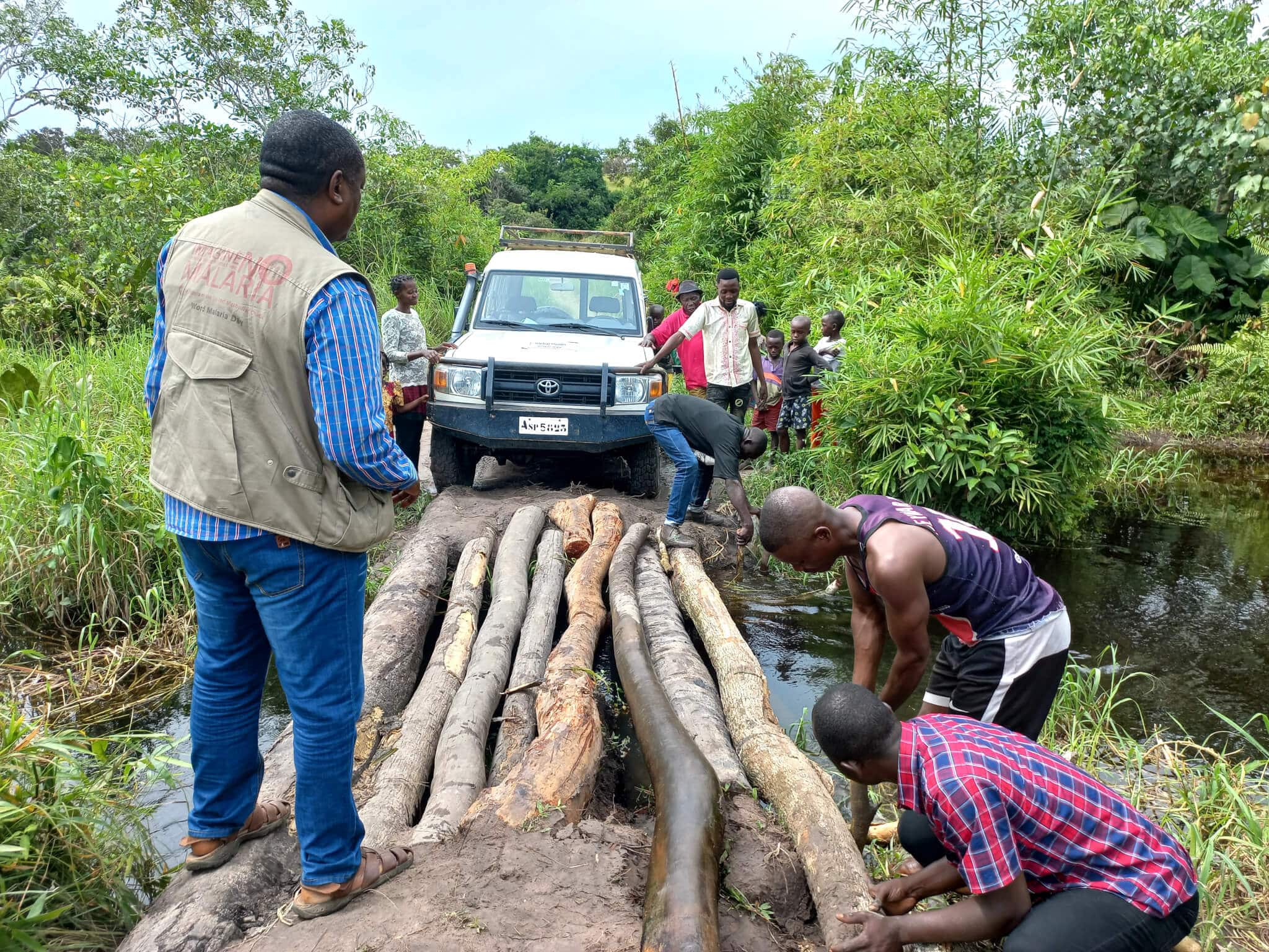 The long road to stocking malaria supplies and medicines in the Central Congo. Often a delivery requires help from community members willing to drop everything and problem solve an obstacle to delivery. (Photo: Courtesy of Central Congo UMC Health Board)